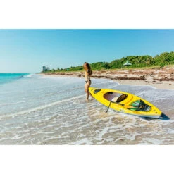 The MAXIM 100X recreational kayak is specially designed for novice paddlers who want to have fun on the water with ease and comfort. Built with a shallow V-chine hull, this sit-in kayak provides excellent maneuverability and steering while being very stable. It includes molded footrests, an adjustable padded ERGOFORMâ„¢ backrest with ERGOBASEâ„¢ seat, a cockpit table and a rear compartment, perfect for storing your personal belongings. Tackle any adventure with confidence with this super versatile Pelican recreational kayak!KZ10,275